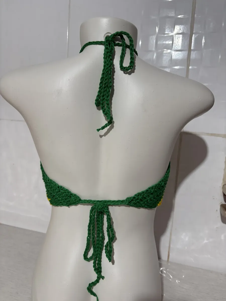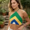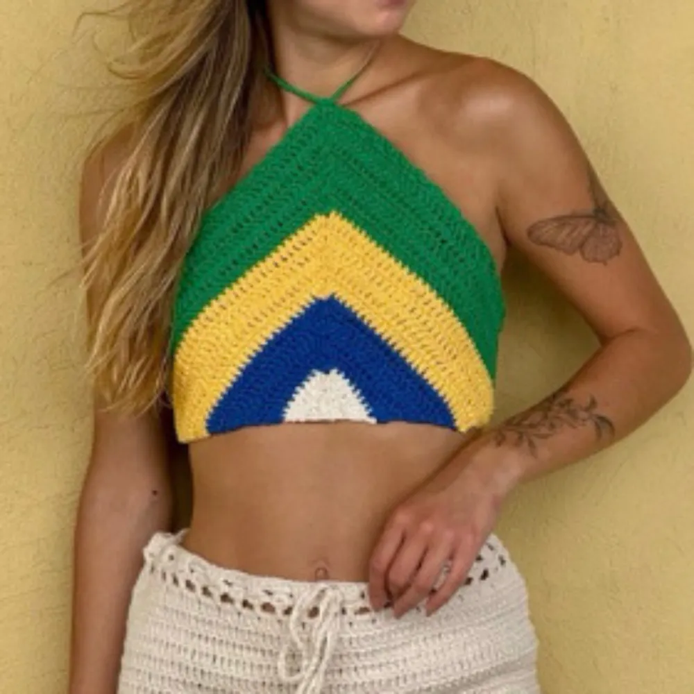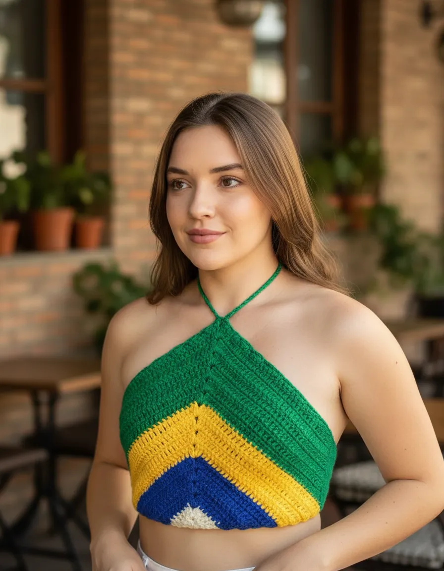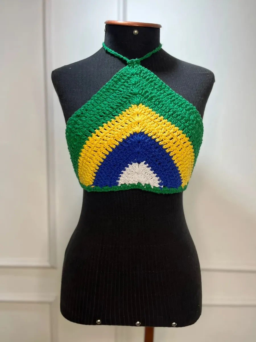 Carnaval, Casual, Crochet, Cropped Brasil, Cropped Copa, Cropped Crochê, Cropped Frente única, Cropped Moda Verão, Cropped luxo, Look Brasil, Look Copa, Look Feminino Brasil, Moda GRinga, Praia, Trico Premium, Verão, moda casual